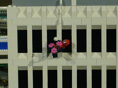 仔細一看,原來是蜘蛛人垂降下來,手中還拿著花朵,看來是要去把瑪麗蓮了~